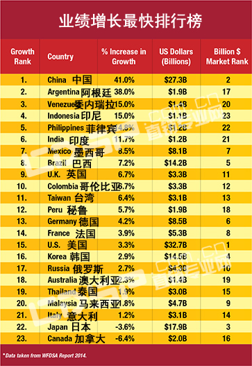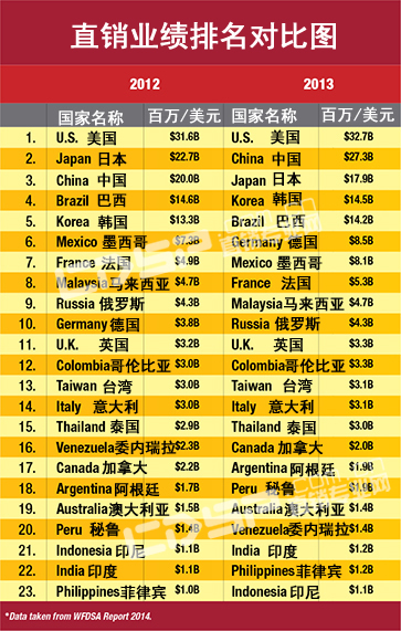 鉴于目前的成长速度,中国将极有可能超越美国,成为最大的市场规模。2013年,中国直销业绩为为273亿美元,同比增长达到了惊人的41%,并且创造了业界最高的累计增长率——23.3%。