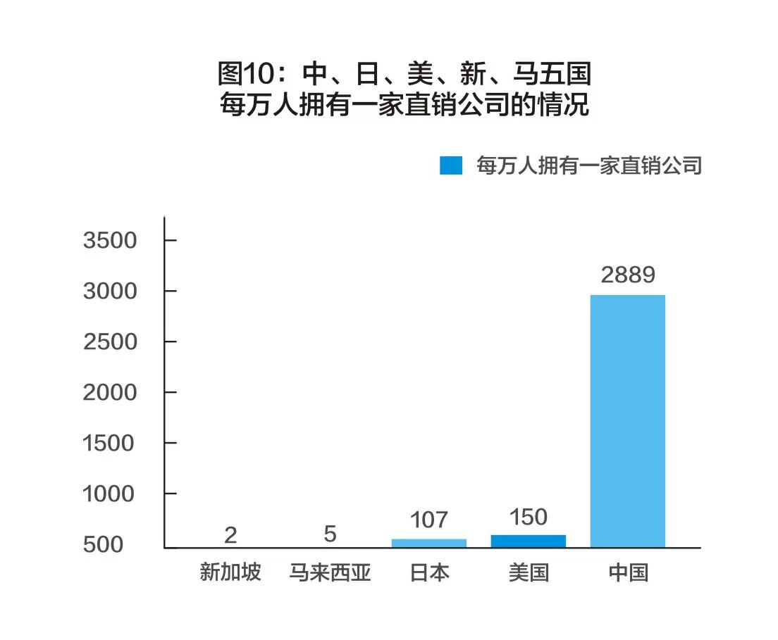 从上图可知,按照国家人口数量与该国直销企业的数量来算,中国每万人拥有一家直销公司的值最高。在新加坡,每2万人就拥有一家直销公司,在马来西亚,每5万人拥有一家直销公司,在日本,每107万人拥有一家直销公司,在美国,每150万人拥有一家直销公司。但是,在中国,每2889万人才拥有一家直销公司。这充分说明,按照国家的人口与直销企业数量之间的比值来算,我国直销企业的数量与日本、韩国、美国、新加坡、马来西亚等发达、发展中国家直销市场还有巨大的差距,直销市场的竞争还远远没有充分。直销仍然是传统企业寻求新盈利增长点的上佳选择。