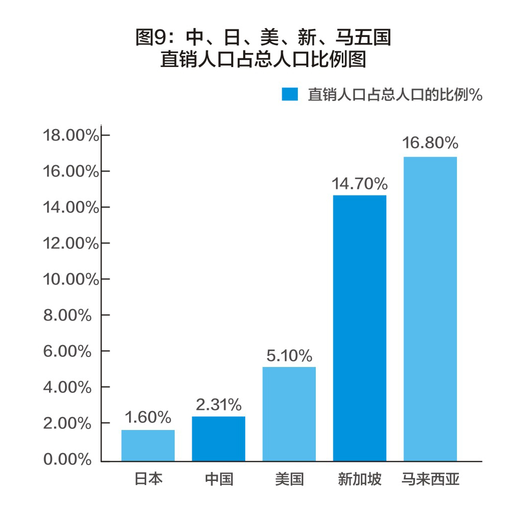 据商务部发布的《2012年直销行业发展报告》,我国直销员的规模在234万人,但这一数据可能过于保守。一般认为,我国直销员的规模在3000万人左右。若按以上两个数据折算,则我国直销员的规模占总人口的比例在0.18%--2.31%之间,与成熟直销市场的5%的比例还存在大量的差距,意味着中国直销人口还有大幅增长的空间。一些国家的数据可能会让直销人感到惊喜:日本的人口是1.3亿人,直销人口占总人口的比例是1.6%,直销公司不低于100家;美国的人口是3亿人,直销人口占总人口的比例是5.1%,有200多家直销公司;新加坡的总人口是400万人,直销员占总人口的比例高达14.7%,全国有200家直销公司;马来西亚的人口是2800万人,注册直销员的规模占总人口的比例高达16.8%,有600家直销公司,并且马来西亚政府出台了《2013年至2020年直销发展大蓝图》,鼓励直销行业大力发展。