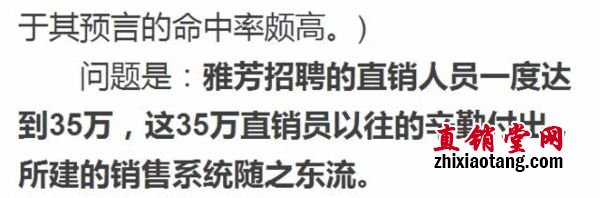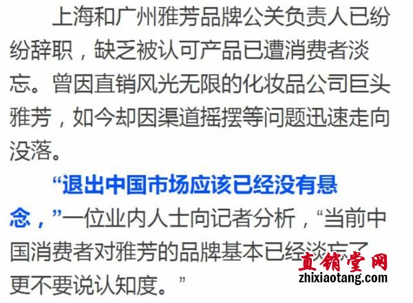雅芳退出中国的事件发生,我们同样要喊一些口号,以此来提醒、告戒“难民”、“乞丐”们:坚持,并不一定是正确的;方向不对,努力白费;选择大于努力;我们可以坚持梦想,决不能坚守阵地。方法正确,事半功倍;条条大路通罗马,最最关键是方法!这是错误地延用、借取了发达国家的直销理念的结果。