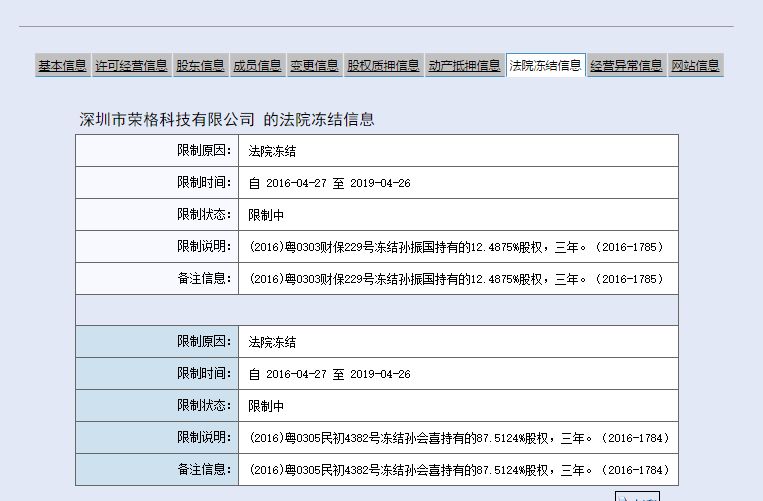 因孙会喜和孙振国一直阻挠孙小玲行使合法的股东权利,孙小玲分别以离婚后财产纠纷和解除委托持股纠纷向深圳市南山区人民法院、深圳市罗湖区人民法院起诉,要求孙会喜和孙振国履行协议,并依法冻结了两个人名义上持有的股份。但据说因孙会喜、孙振国在司法机关多次通知的情况下,拒不接收法院开庭通知和相关司法文书,现处于公告送达阶段(公告期为90天,通过咨询专业法律人士,这很符合在明知胜诉无望情况下拖时间的诉讼策略)。从深圳市市场监督管理局官网,查询到孙会喜、孙振国两人的法院冻结信息(见下图)。