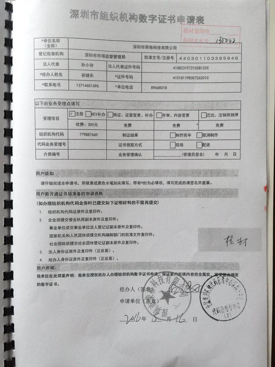 广东南天司法鉴定所鉴定荣格公司5月16日 的《深圳市组织机构数字证书申请表》所盖公章为伪造公章。