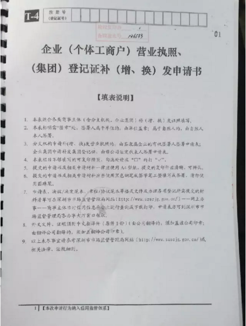 涉嫌伪造的公章补办《营业执照》的申请书