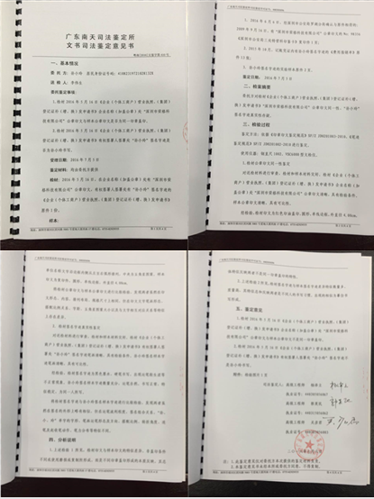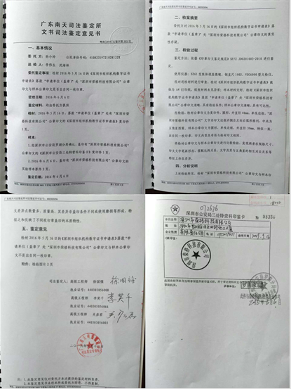 孙小玲提交涉嫌伪造的公章与字迹的鉴定书,鉴定结果显示皆为虚假,非荣格公章与孙小玲字迹。