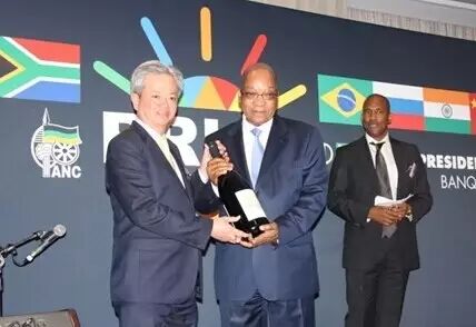 完美公司董事长古润金(左一)向南非总统祖马(中)赠送特制3L拉格诺西拉红葡萄酒