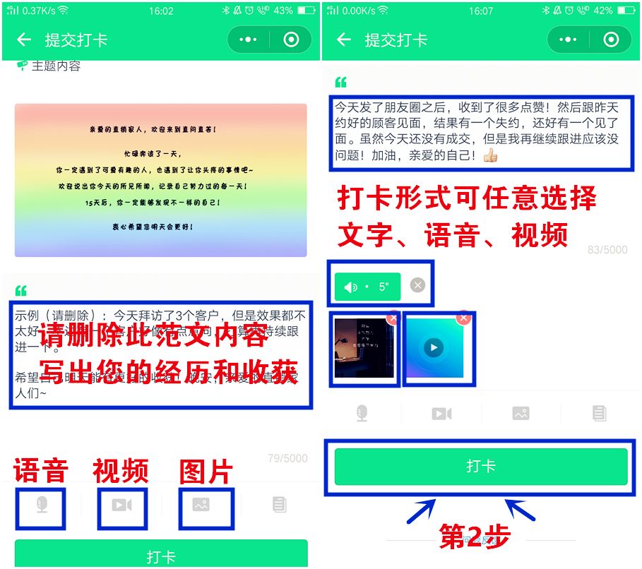 第二步:打卡,输入今日经历及感悟(收获),文字、语音、图片、视频任选,可单一,可丰富多样;然后提交即可。