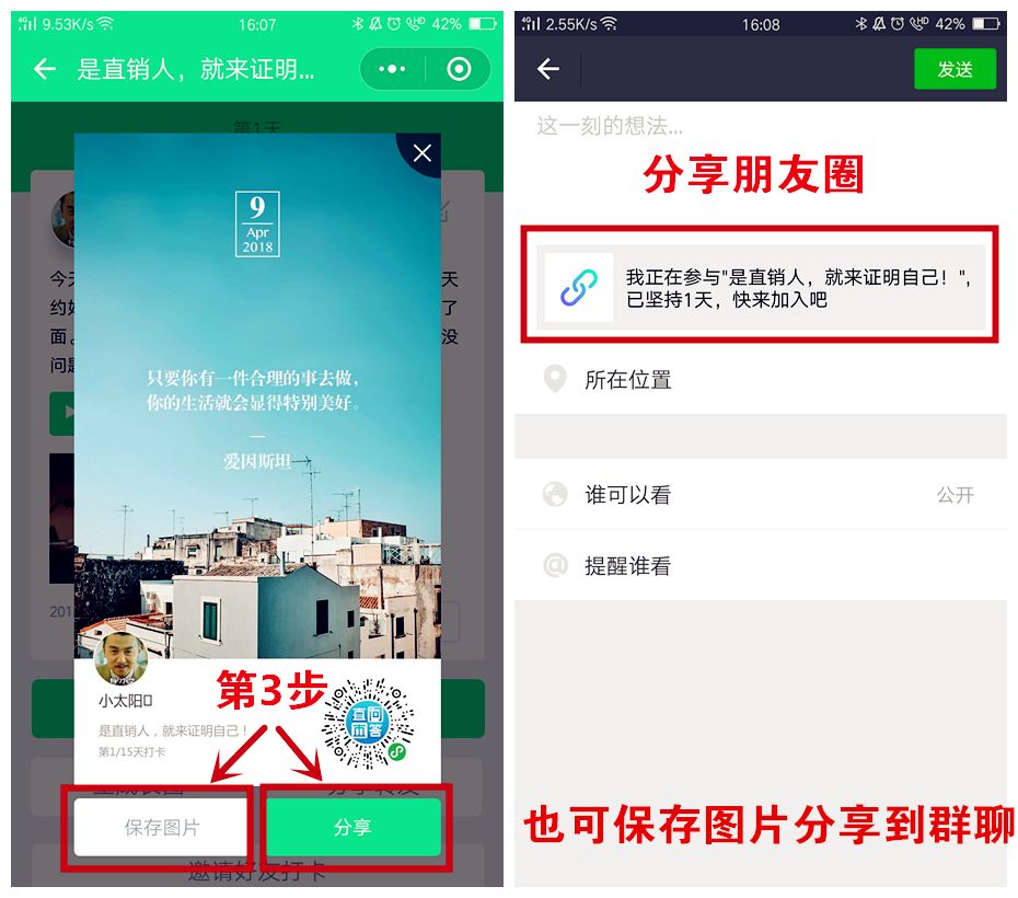 第三步:打卡提交之后,系统会自动生成每日日签图,保存图片分享至群聊或朋友圈,完成当日打卡。