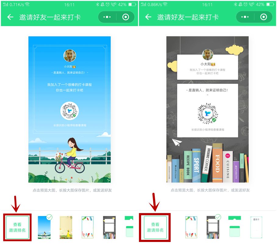 然后系统就会生成你的专属分享图,再将此图分享至朋友圈或者群聊,你的好友通过本图二维码参加打卡活动,即增加一个你的邀请人数!