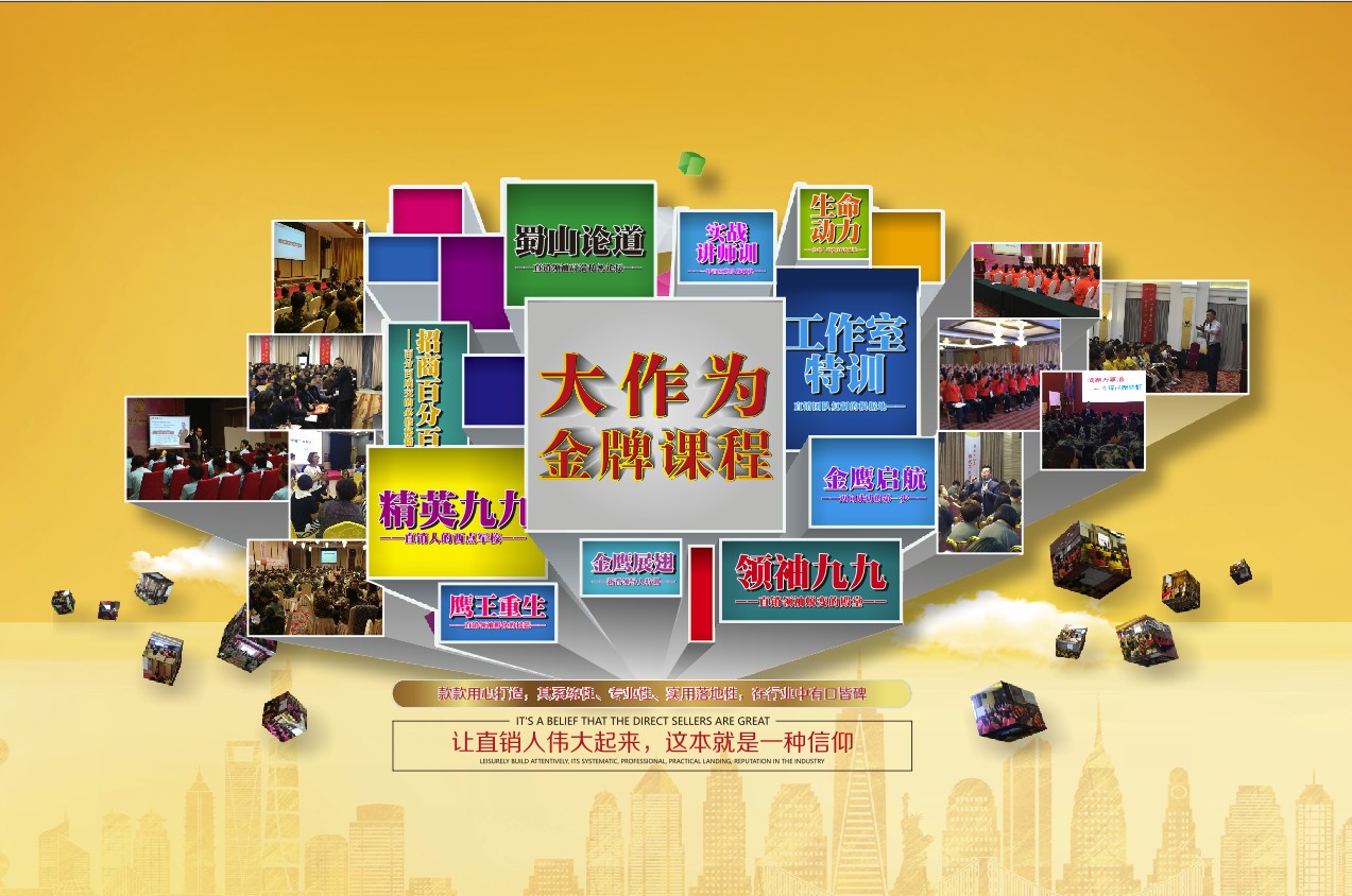 19年来,大作为创作出“团队正气歌”、“直销三字经”等指引行业正向发展的非营利性行业工具,潜心研发了《蜀山论道》、《领袖九九》、《精英九九》、《鹰王重生》、《生命动力》、《金鹰起航》、《金鹰展翅》、《金鹰翱翔》、《实战讲师训》、《招商百分百》、《工作室特训》等课程。课程从心法到方法,从团队的战略运作,到核心组建、骨干打造、心灵成长、新人起步……覆盖直销系统各个阶段的需求,制定了从新人到团队领导人的各个阶段的角色定位、工作流程、工作标准,被广为流传,对众多直销人形成了广泛而深远的影响。