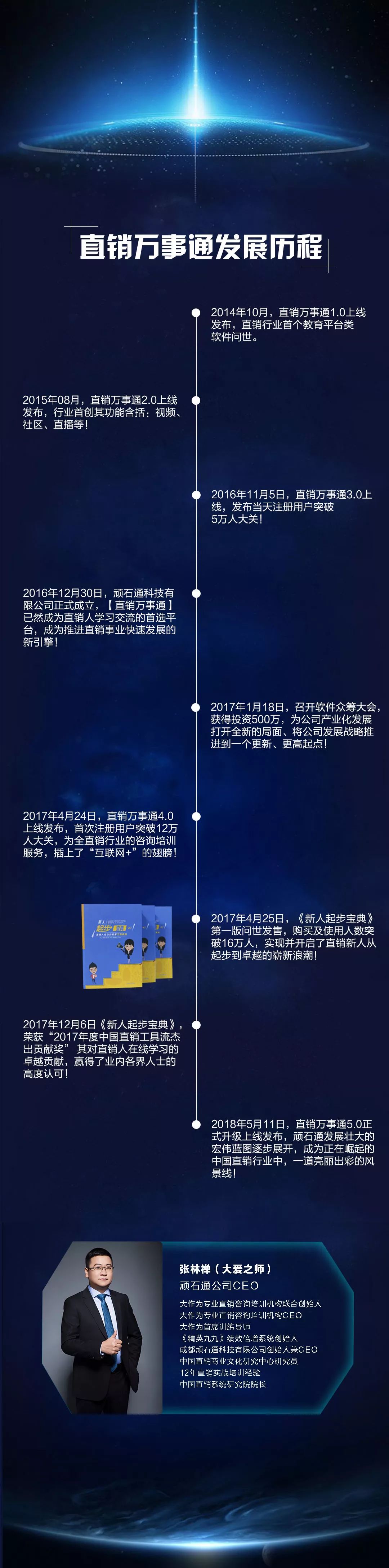 也正是源于这样的思考,张林禅先生成立了顽石通科技公司,以直销万事通为主打产品,让线上培训福泽更多人。于是,2014年直销万事通1.0上线,第一个专注于直销行业的首个教育平台类软件也正式问世。
