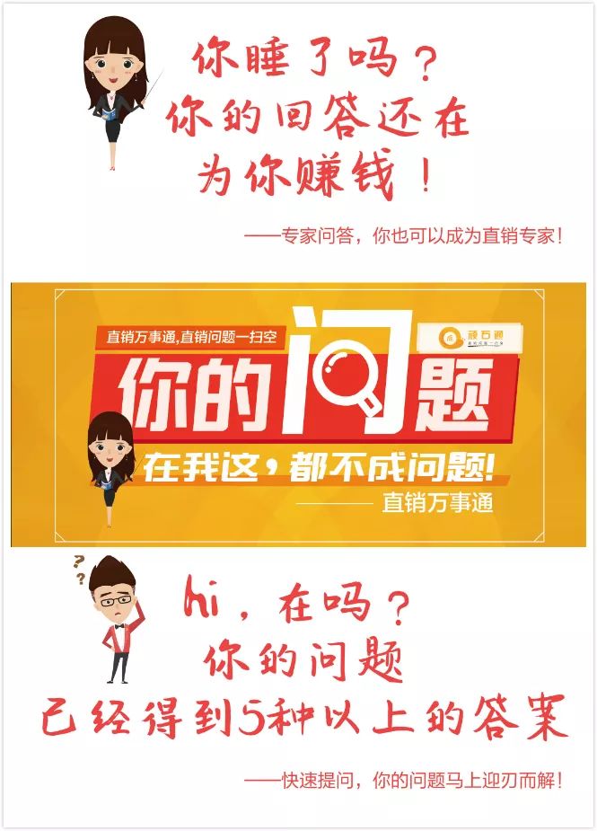现在的直销万事通不管是从人机交互、UI设计,还是从主要功能板块方面,都进行了革新。直销万事通5.0以“在线及时问答”为主要功能板块,一方面顺应了当下知识可以产生价值的浪潮,另一方面更是为了直销家人考虑:不管是您是直销新人还是直销领袖,在这一路的奋斗过程中,总会遇到一些困惑和难题,而这里就为直销人提供了一个专属问答服务区。
