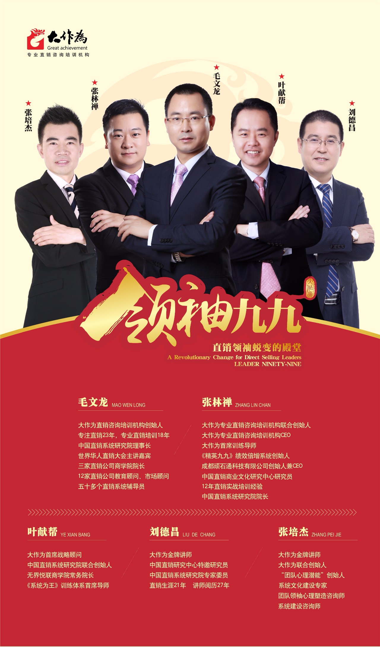 本期《领袖九九》之“系统战略”课程由大作为殿堂级培训导师毛文龙、叶献帮、张培杰担任主讲,同时大作为还抽调了十余位导师组成专家团莅临现场为学员提供全程指导咨询服务。