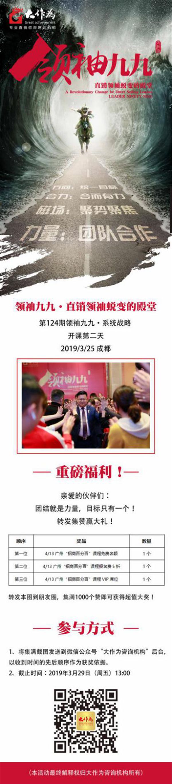 4月23-25日,《领袖九九》再次在成都开讲,助您实现直销领袖的完美蜕变。